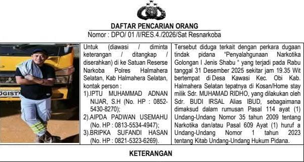 Penetapan DPO tersebut tertuang dalam surat bernomor DPO/01/I/RES.4./2026/Sat Resnarkoba. Peristiwa dugaan tindak pidana narkotika ini terjadi pada Rabu, 31 Desember 2025, sekitar pukul 19.35 WIT, di sebuah rumah kos di Desa Kawasi, Kecamatan Obi,Kabupaten Halmahera Selatan, Maluku Utara.