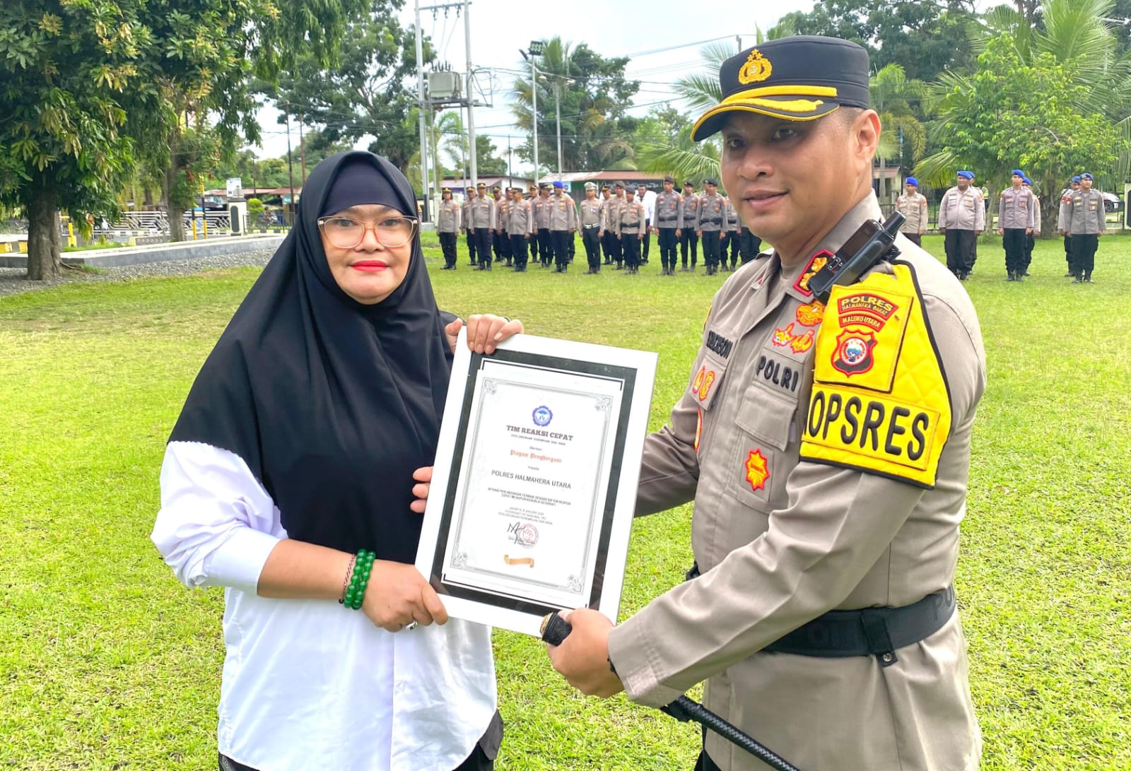 Penghargaan tersebut diberikan kepada Kapolres Halmahera Utara AKBP Erlichson Pasaribu, S.H., S.I.K., bersama sejumlah personel Satreskrim Polres Halmahera Utara dalam sebuah upacara yang berlangsung di Mapolres Halmahera Utara.